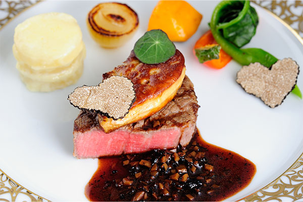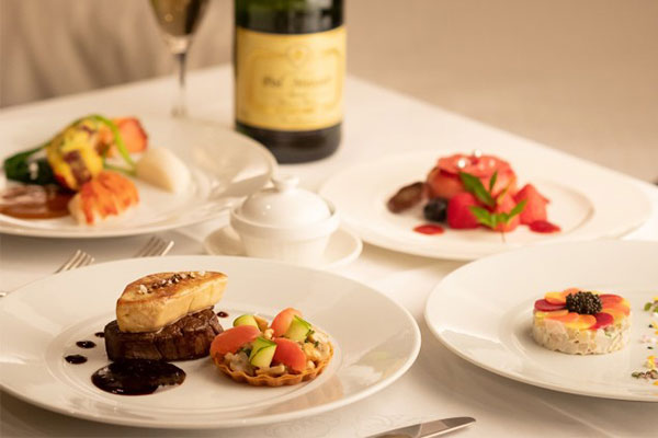 オマール海老を使用した彩り豊かな前菜や「黒毛和牛フィレ肉とフォアグラのロッシーニ」など、見た目も味わいも華やかな本格フレンチコース。おすすめのペアリングドリンクには「テタンジェ ブリュット レゼルヴ(グラス3000円)」もご用意いたします。